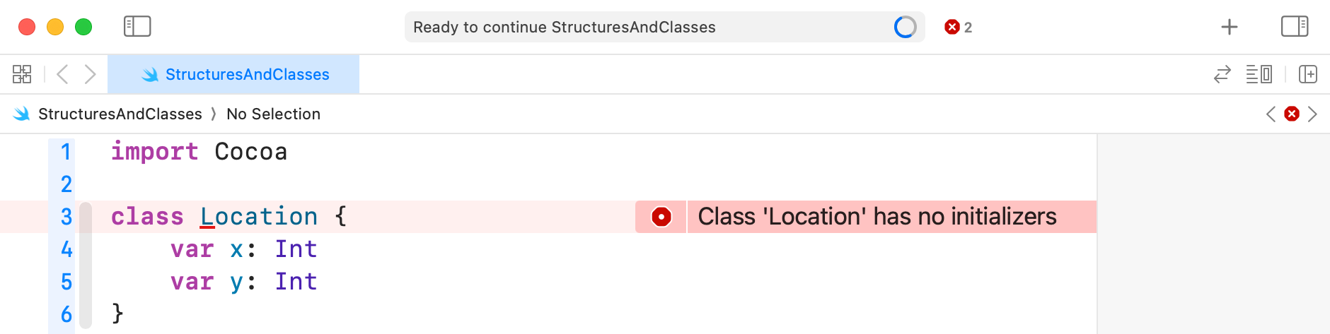 Fortunately, we do not need to write the initializer for a class manually – Xcode will do it for us. Make edits to your code as follows: