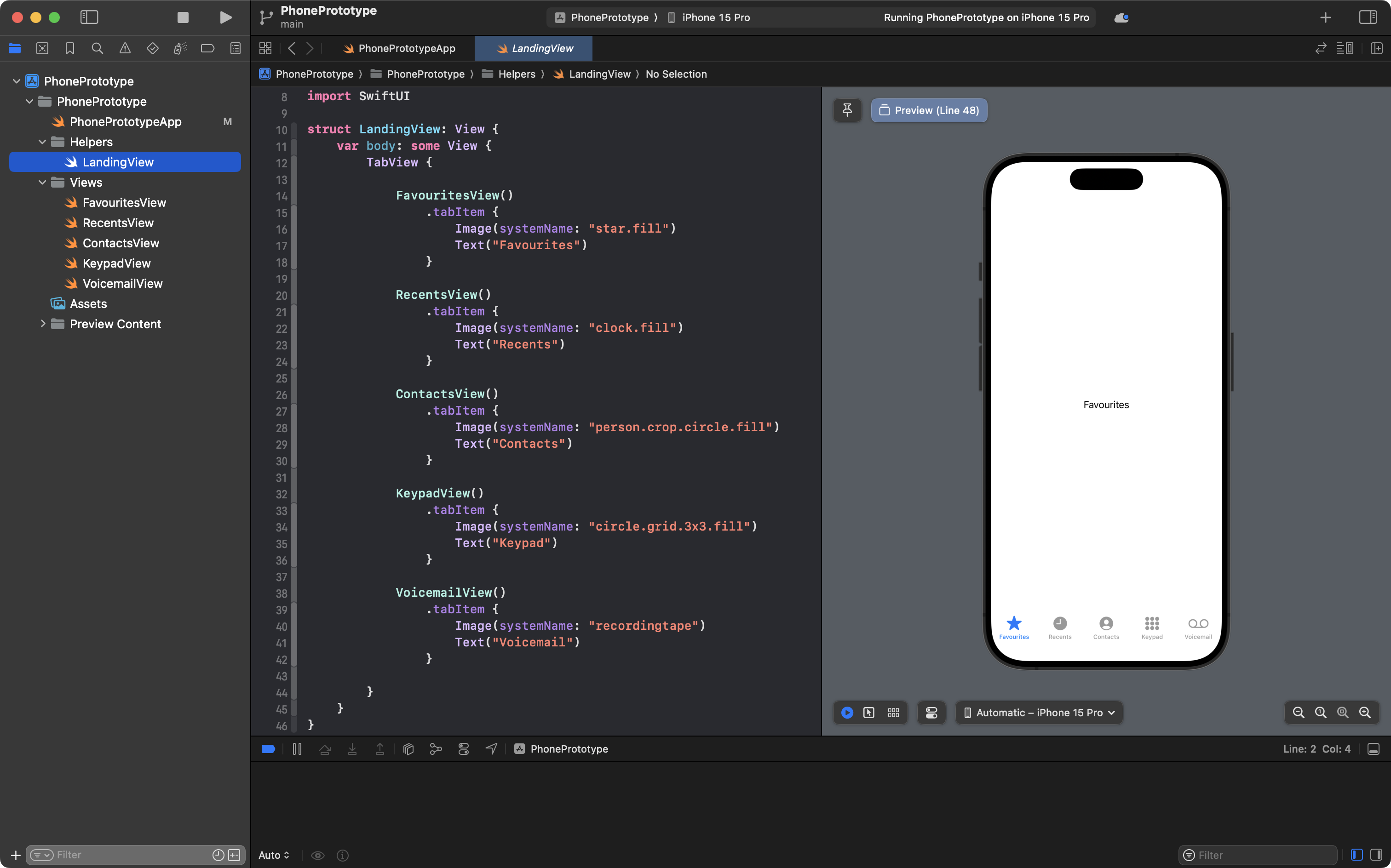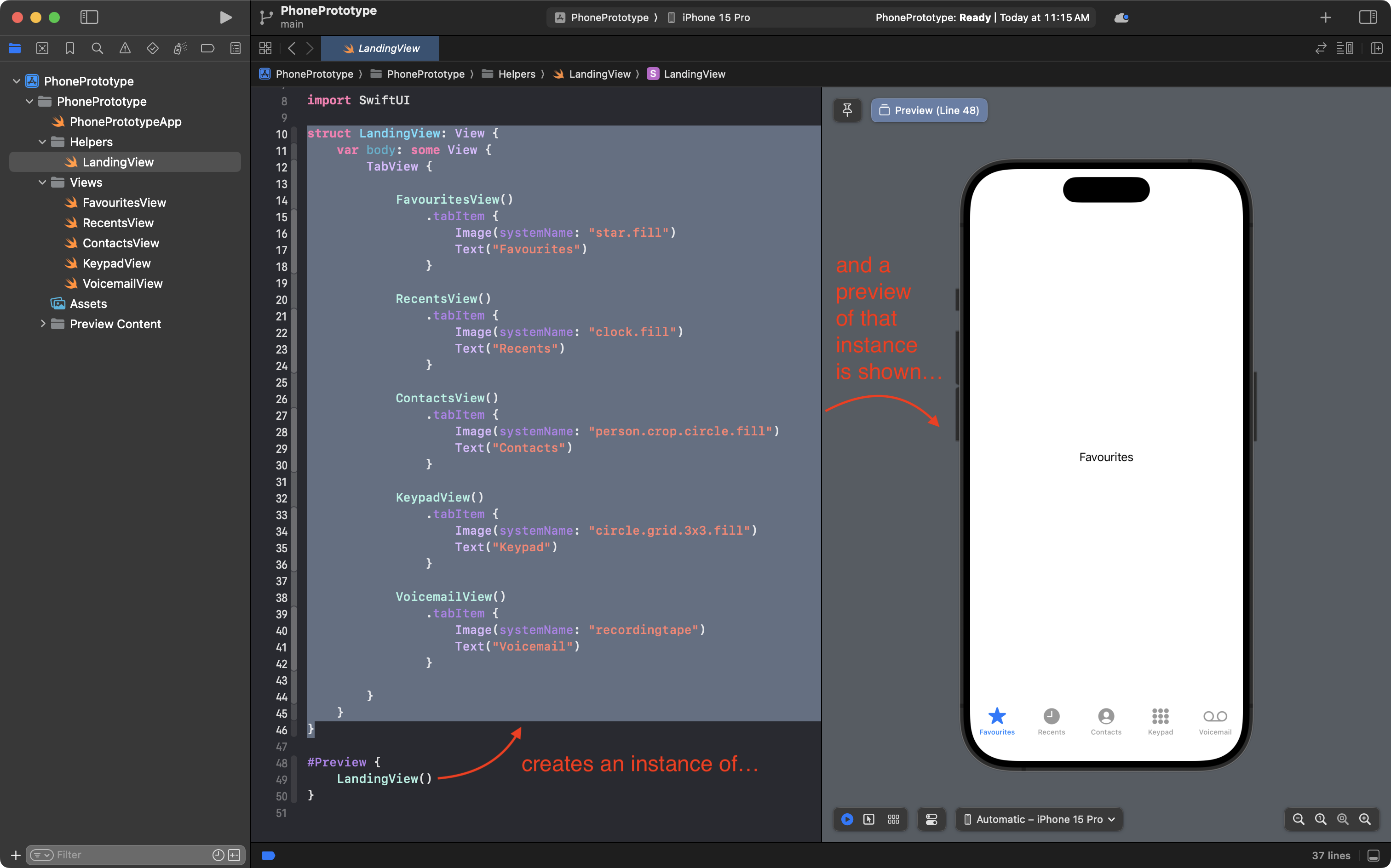 For this particular app, what we want to do is create an instance of LandingView because that is what (in turn) creates a TabView – that much is clear when we preview the LandingView file: