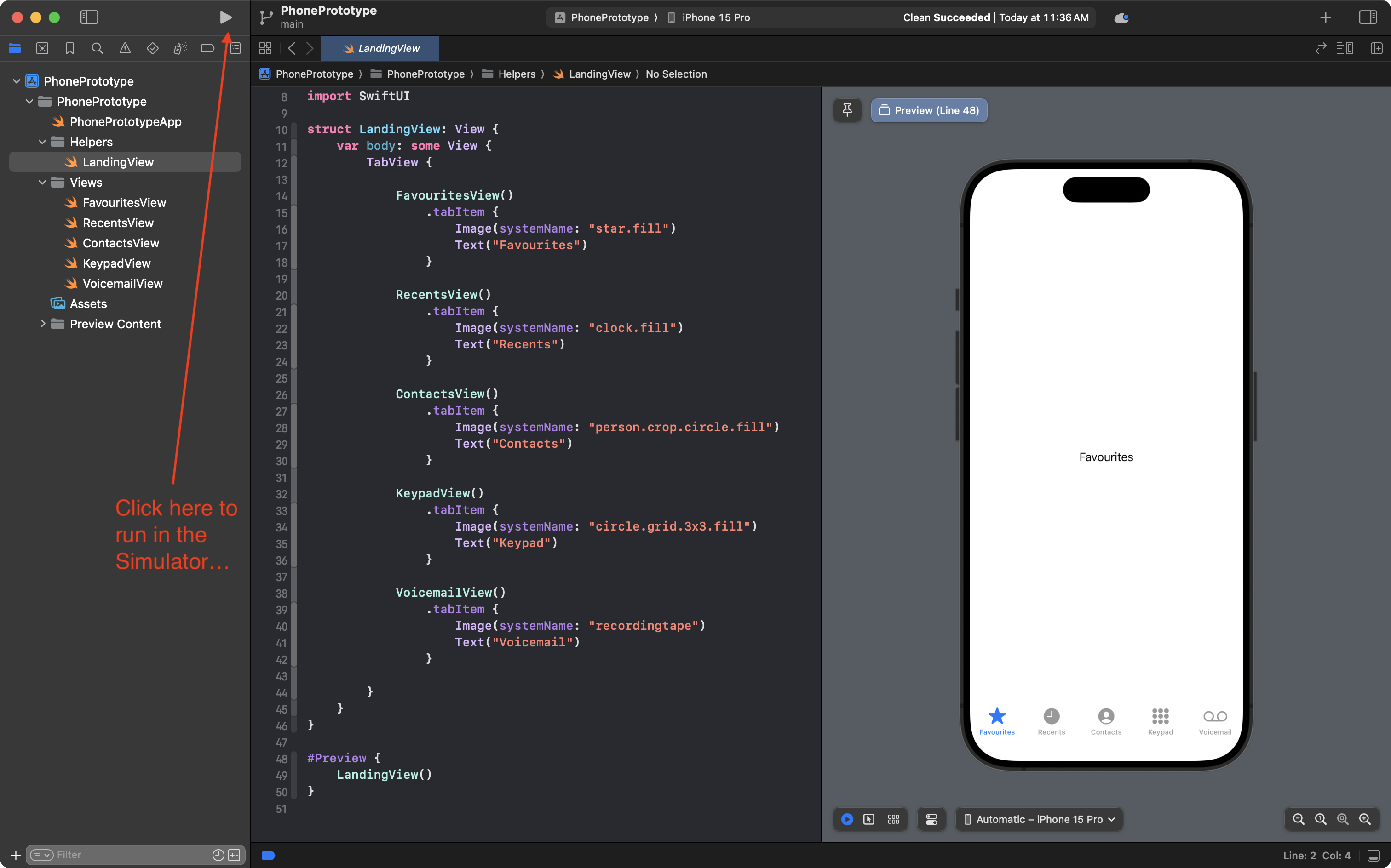 Now, you should be able to preview and run the project in the Simulator. We will learn how to do this now…
