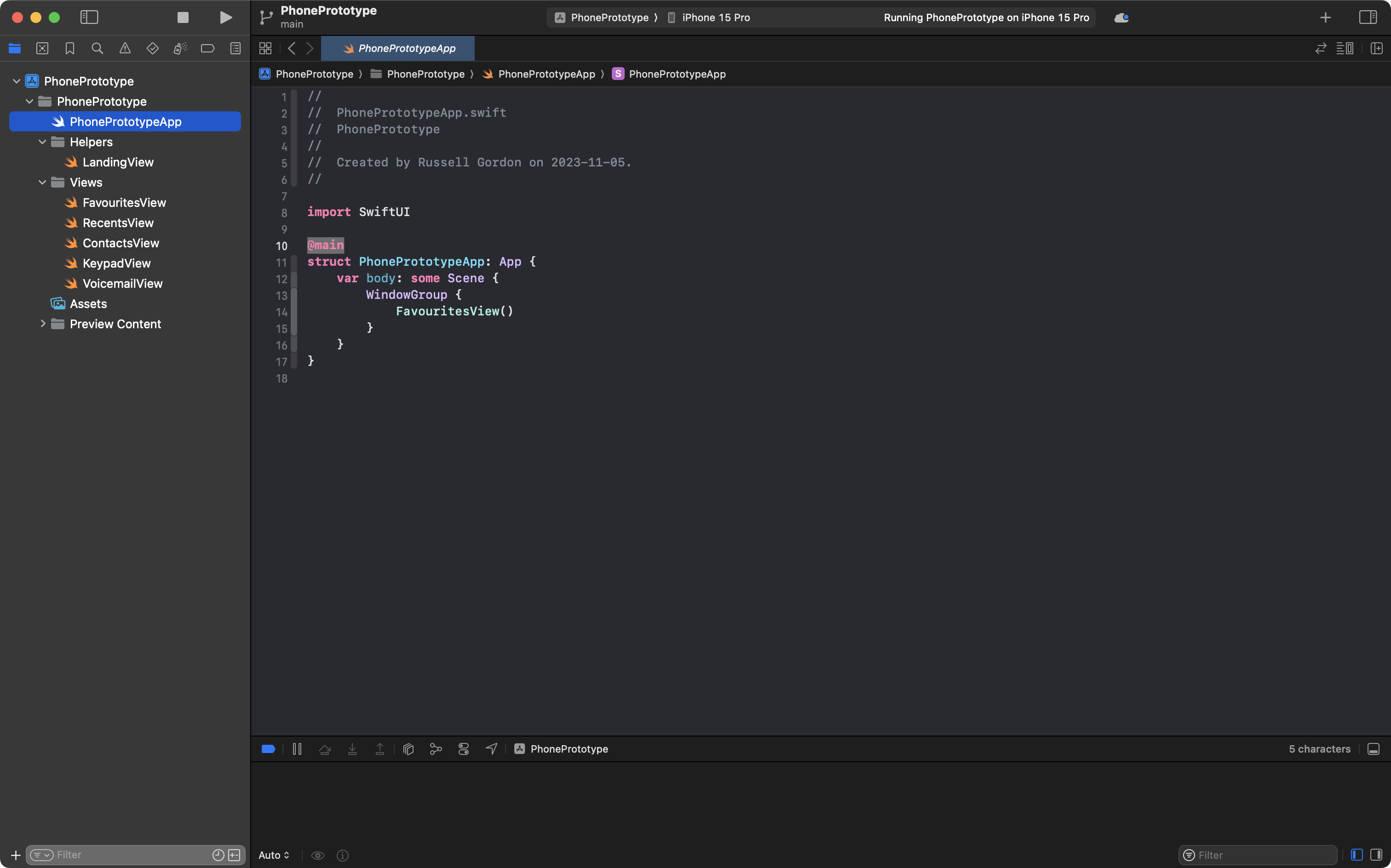 The PhonePrototypeApp structure, in this example, eventually creates an instance of FavouritesView, as shown on line 14: