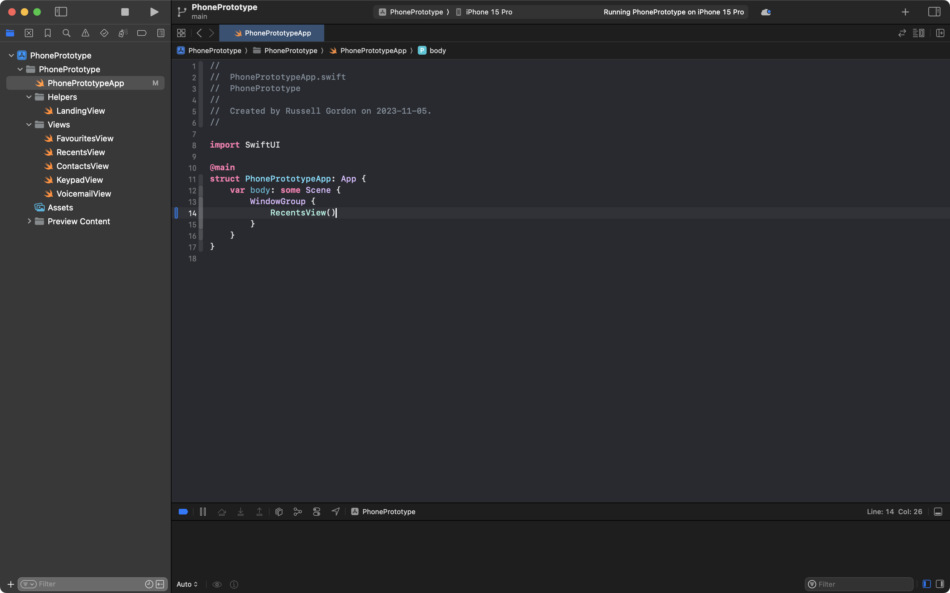 Press Command-1 to be sure you have the Project Navigator open, then expand the Helpers and Views folders, then select the LandingView file. You should see something like this: